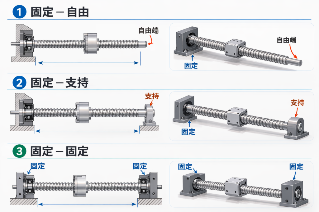 また、ナットがテーブルやスライダなどの移動体に剛性の高い状態で固定されている場合には、ナット位置が軸の支持点として機能するため、支持条件は固定-固定として取り扱うことができます。
